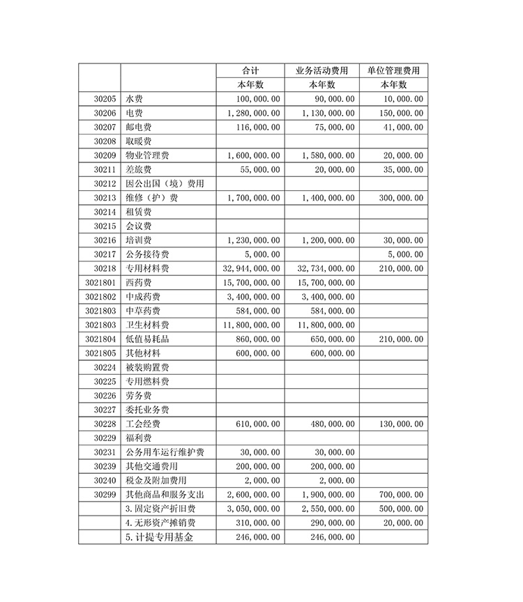 医疗活动费用支出包括:人员经费支出3925万元,药品费支出1969万元,卫生材料费用1240万元,其他商品及服务支出1090万元,固定资产折旧费及无形资产摊销336万元,计提医疗风险金24万元,利息支出156万元。