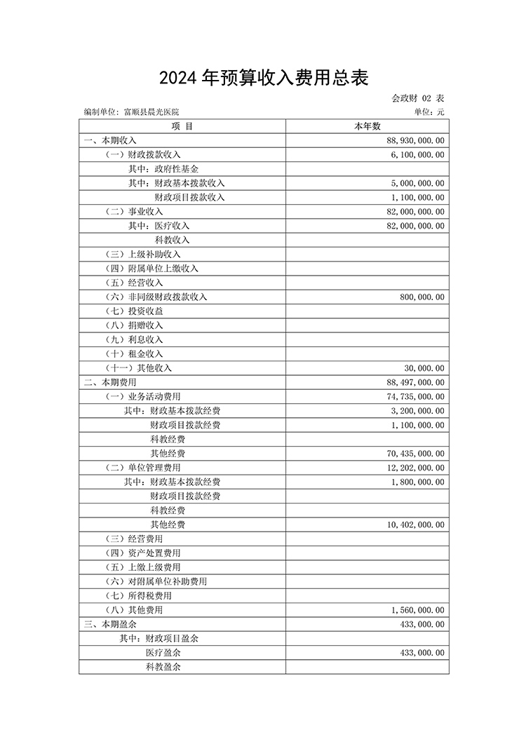 2024年医院预算总支出8850万元,其中:医疗活动费用支出8740万元,财政项目拨款支出110万元。