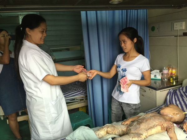 小欣雨的父母家住峨眉山市龙池镇富友村5组,其母亲为右下肢三级残废,长期在富顺打工为生,收入微薄(月家庭收入1000多元),在心疼孩子的同时,也备受治疗费用的煎熬(预计治疗费用在10多万元)。晨光医院烧伤科不仅为小欣雨制定了最佳的治疗方案,还为小女孩家遇到的困难出主意、想办法,与小欣雨父母一起向“微信轻松筹”救助,希望得到社会各界爱心人士的帮助。一时间微信圈里都在为这位可怜的小女孩转发。晨光医院通过医院的微信平台向全院广大干部职工发出倡议为小欣雨奉献爱心,广大干部职工通过“微信轻松筹”或直接到病房为小欣雨捐款而不留姓名。50元、100元……,一份爱心、一声问候、一份关爱,都给了家属巨大的力量和信心。社会各界通过“微信轻松筹”得知小欣雨的病情和家庭面临的困难时,有的通过“微信轻松筹”捐款,有的直接到医院看望小欣雨并现场捐款,通过医院广大职工和社会各界爱心人士短短几天的共同努力,已募集到10多万元的善款,解决了患儿家属的后顾之忧。