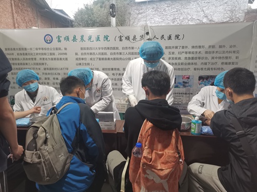 在富顺县晨光医院高考体检场,全体人员全程规范佩戴口罩、测量体温,根据现场的指示标识,医院带队老师带领考生有序排队,依次进行采血、内外科、视力、嗅觉、听觉、胸片、总检等项目的体检。富顺县晨光医院的医务人员带着高度的责任感,认真、耐心地为每一位考生服务。