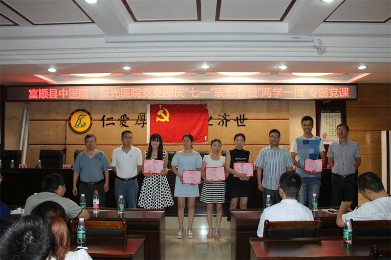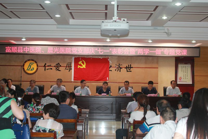 为庆祝建党95周年,富顺县晨光医院党支部和县中医院党支部于6月29日下午,在富顺县中医院四楼会议室联合召开庆“七一”表扬会暨“两学一做”专题党课。会议由县中医院党支部副书记林聪主持,两家医院的院级领导、中层干部、全体党员及获得优秀党员、最美医生和最美护士表彰的人员约100人参加了会议。会议共三项议程。