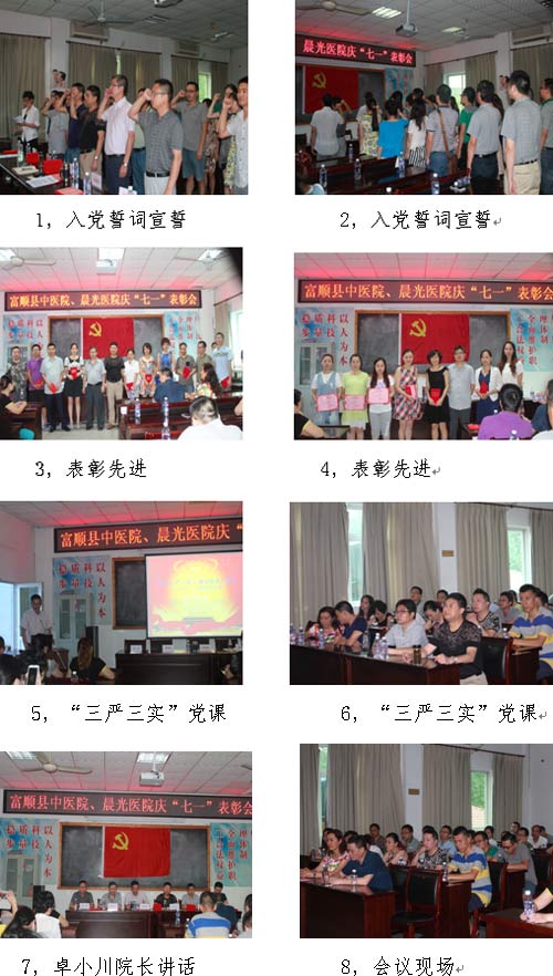 为庆祝建党94周年,富顺县晨光医院党支部和县中医院党支部于6月30下午,在晨光医院大会议室联合召开庆“七一”表彰会,会议由县中医院党支部副书记林聪主持,会议共四项议程,两家医院的院级领导、全体党员、优秀党员、优秀医生和优秀护士共60余人参加了会议。