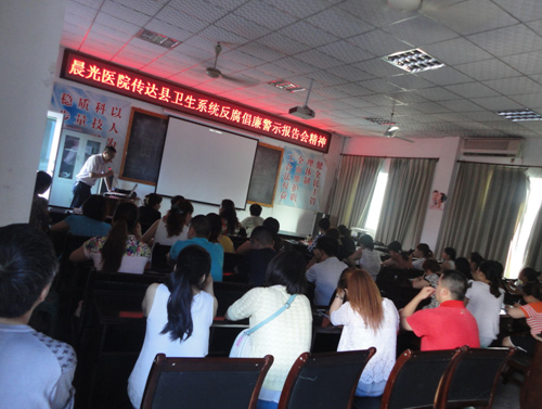 会上,党办主任以幻灯片的形式与大家共同学习了开展医德医风建设的意义、医德规范的内容以及医疗行业应该遵守的职业道德和纪律,并通过一些典型案例直观讲解了某些党员领导干部一步步沦为阶下囚的蜕变轨迹,使干部职工受到教育,从中吸取深刻教训。