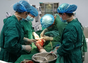 4月3日,富顺县晨光医院副主任医师蒋君志带领团队对患者行右下肢清创、焦痂切除、血管神经探查、大腿平面截肢、异种皮覆盖术等手术,首次手术顺利。