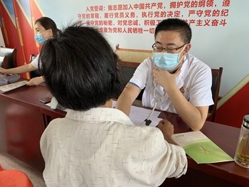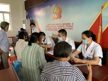 医院党支部书记、院长黄永生为田边村贫困户讲党课;帮扶责任人入户走访,与贫困户进行了面对面交流,进一步了解其生产生活及收入情况,更新填写帮扶手册,并对扶贫政策进行了宣讲;医务人员现场为贫困户及村民进行血压检测、内外科检查、彩超、康复理疗(含三伏贴)等,指导贫困户如何预防疾病并接受健康咨询。